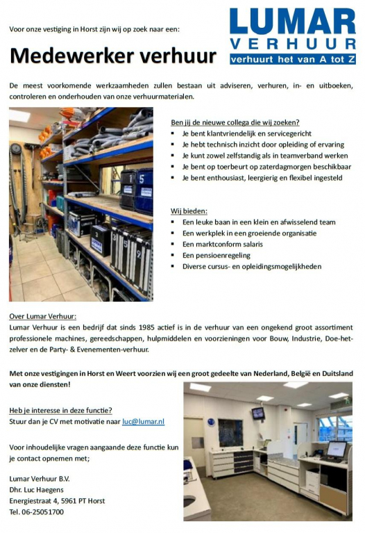 De meest voorkomende werkzaamheden zullen bestaan uit het adviseren, verhuren, in- en uitboeken, controleren en onderhouden van onze verhuurmaterialen.
