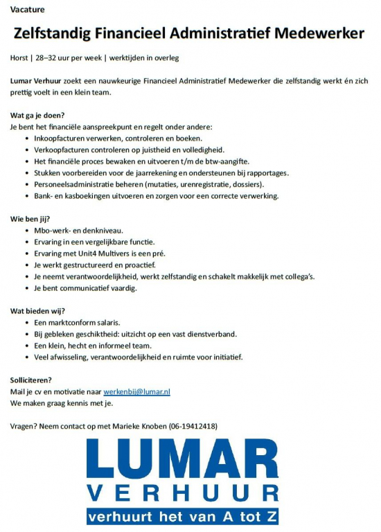 Lumar Verhuur zoekt een nauwkeurig Financieel Administratief Medewerker (M/V)